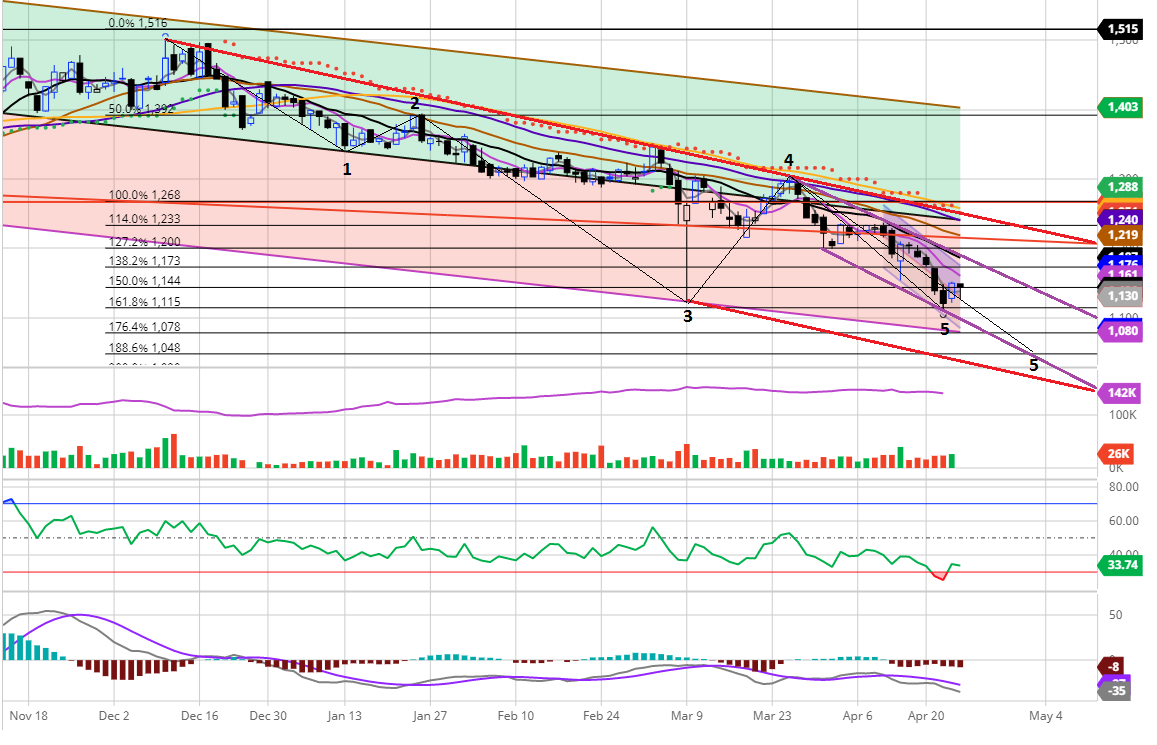 - Theo cách nhìn Elliot, nếu điểm dừng sóng 3 nằm tại 1.123 để tạo sóng 4 ở đỉnh 1.303 (25/03), thì từ đỉnh này London đang gây sóng xuống số 5. Mức đáy hiện tại (1.109) chưa biết có phải là điểm cuối của sóng 5 hay chưa. Nhưng nếu sóng này được mở rộng, thì độ sâu thấy được nằm tại 1.048.