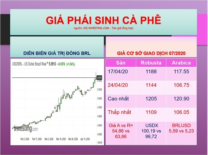 Đồng Reais Brazil (Brl) tuần qua lại lập thêm mức thấp kỷ lục mới với 1 Usd ăn 5,748 Brl (24/04). Brl mất giá là phản ứng của thị trường đối với gói kích cầu của chính phủ Brazil nhằm hạn chế sức tàn phá của dịch Covid-19 đối với nền kinh tế, nhưng thâm hụt ngân sách chính là nỗ lo xa hơn. Giá trị đồng Brl đóng vai trò rất lớn trong hoạt động giá cả của hai sàn cà phê (1).