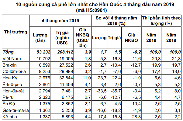 Không những thế, trong 4 tháng đầu năm, xuất khẩu cà phê của Việt Nam đã giảm 5,3% về lượng và giảm 16,3% về trị giá so vơi cùng kỳ năm ngoái. Do đó, thị phần cà phê Việt Nam trong tổng lượng nhập khẩu Hàn Quốc cũng giảm từ 21,8% trong 4 tháng đầu năm 2018 xuống còn 20,3% trong 4 tháng đầu năm 2019.