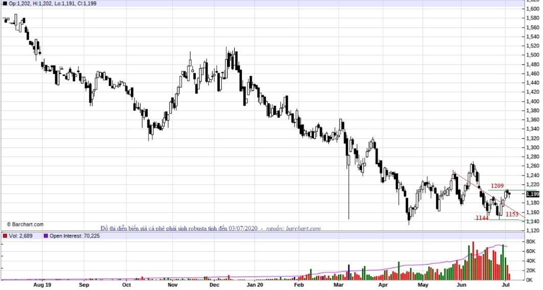 Vượt được đáy 1.144, tuần qua sàn robusta London đã có lúc lên trên mức tâm lý quan trọng 1.200. Nhưng phiên cuối tuần 03/07/2020 lại về nằm dưới mức ấy dể chốt ở 1.199. Dù vậy, về kỹ thuật, nên xem London vẫn còn tích cực nhờ giá đóng cửa nằm trên MA5 và 20 là 1.194 và 1.196.