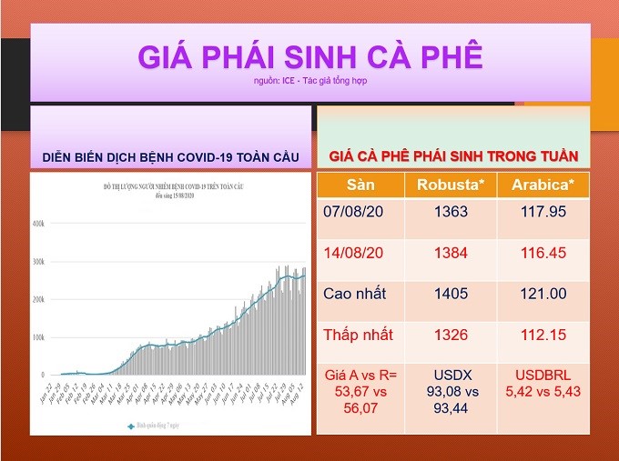 Trên thị trường tài chính, hầu hết giá cổ phiếu các châu lục đều vững và tăng, giá vàng mất mốc 2.000 Usd/ounce để về đóng cửa cuối tuần trước tại 1.950 Usd/ounce, giá dầu thô không mấy thay đổi (WTI 42 Usd/thùng và Brent 45 Usd/thùng), nhiều sàn nông sản tại Mỹ giảm giá trong đó có cà phê arabica nhưng giá cà phê robusta tăng vững.