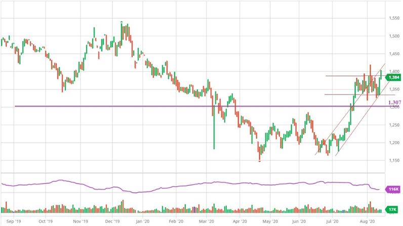 Dấu hiệu suy yếu ngày cuối tuần trước trên sàn New York có thể do sức ép bán tháng 09/2020 xuất hiện trước ngày thông báo giao hàng đầu tiên vào 21/08/2020, tức chỉ còn 5 ngày giao dịch.