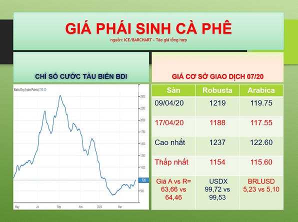 Niêm yết trên tháng 07/2020, giá hai sàn cà phê phái sinh tuần qua dao động khá mạnh. Giá robusta trong biên độ cao/thấp nhất 1.237/1.154 với đóng cửa 1.188 Usd/tấn, giảm 31 Usd so với tuần trước đó. Trên sàn New York, chênh lệch cao/thấp nhất là 122.60/115.60 để đóng cửa giảm 2.20 cts/lb hay chừng -49 Usd/tấn so với ngày 09/04/2020.
